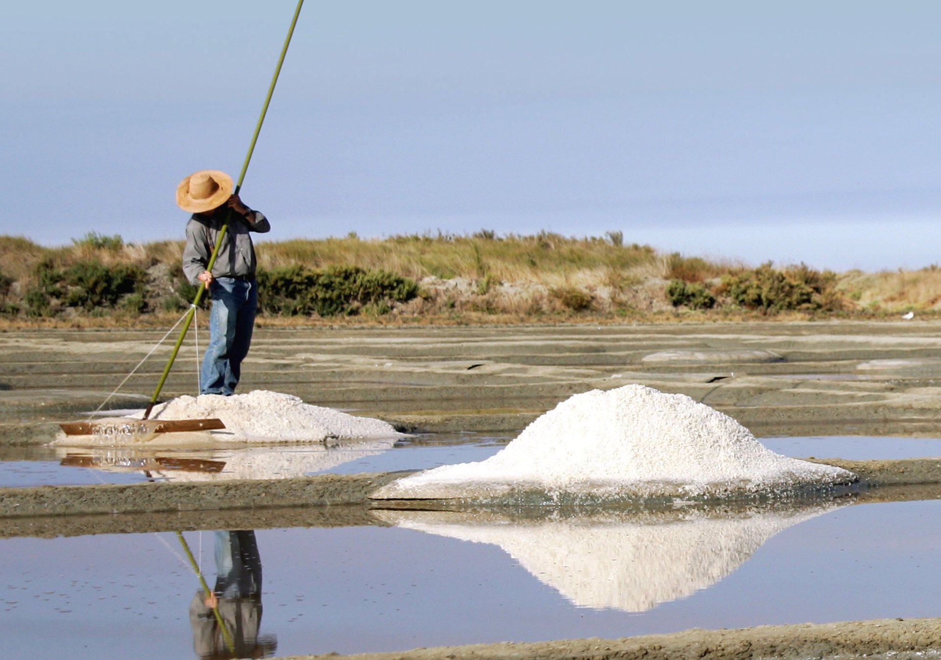 et la fleur de sel, plus fine, qui se forme à la surface de l’eau sous l’effet du vent et du soleil.